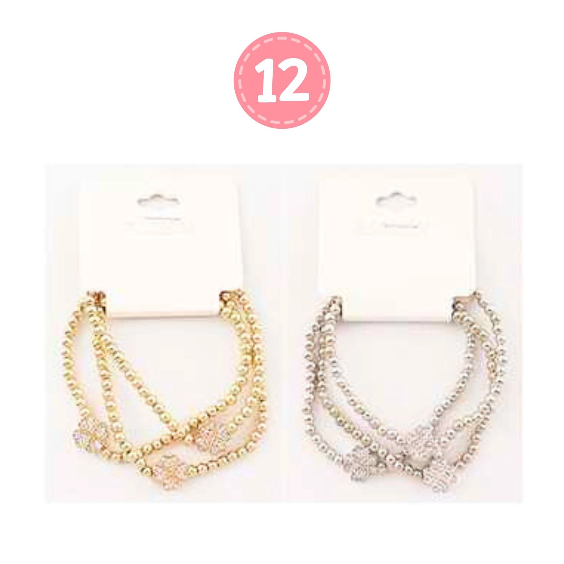 Why stack one when you can wear three? This effortless multi-strand bracelet gives you the perfect stacked look instantly. It features three rows of delicate metallic beads and is accented by three sparkling rhinestone clover (or flower) clusters.