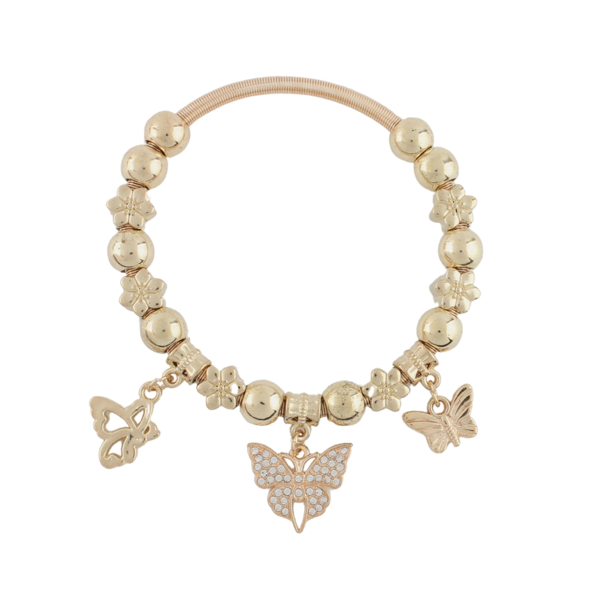 The bracelet is adorned with three dangling butterfly charms, adding a delicate, whimsical touch: