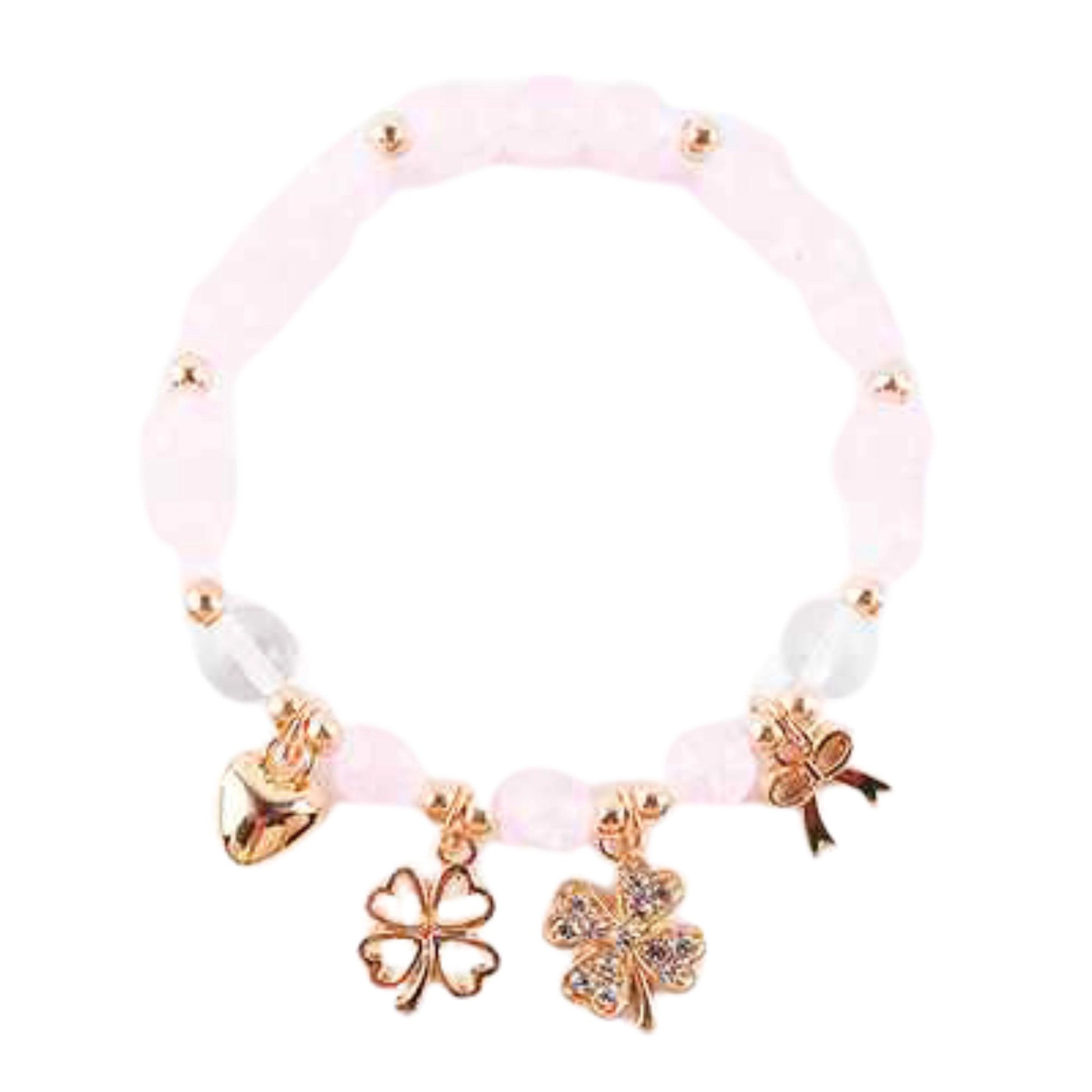 Bring a touch of charm and positivity to your style with this Pink Beaded Charm Bracelet with Clover and Heart Charms. Featuring soft pink faceted beads accented by gold-tone details, this bracelet exudes feminine elegance. Adorned with a mix of lucky four-leaf clover, heart, and bow charms, it’s a symbol of love, hope, and good fortune. The stretch design ensures a comfortable fit, perfect for daily wear or gifting to someone special. A delightful and meaningful accessory that adds sparkle and luck to every look!