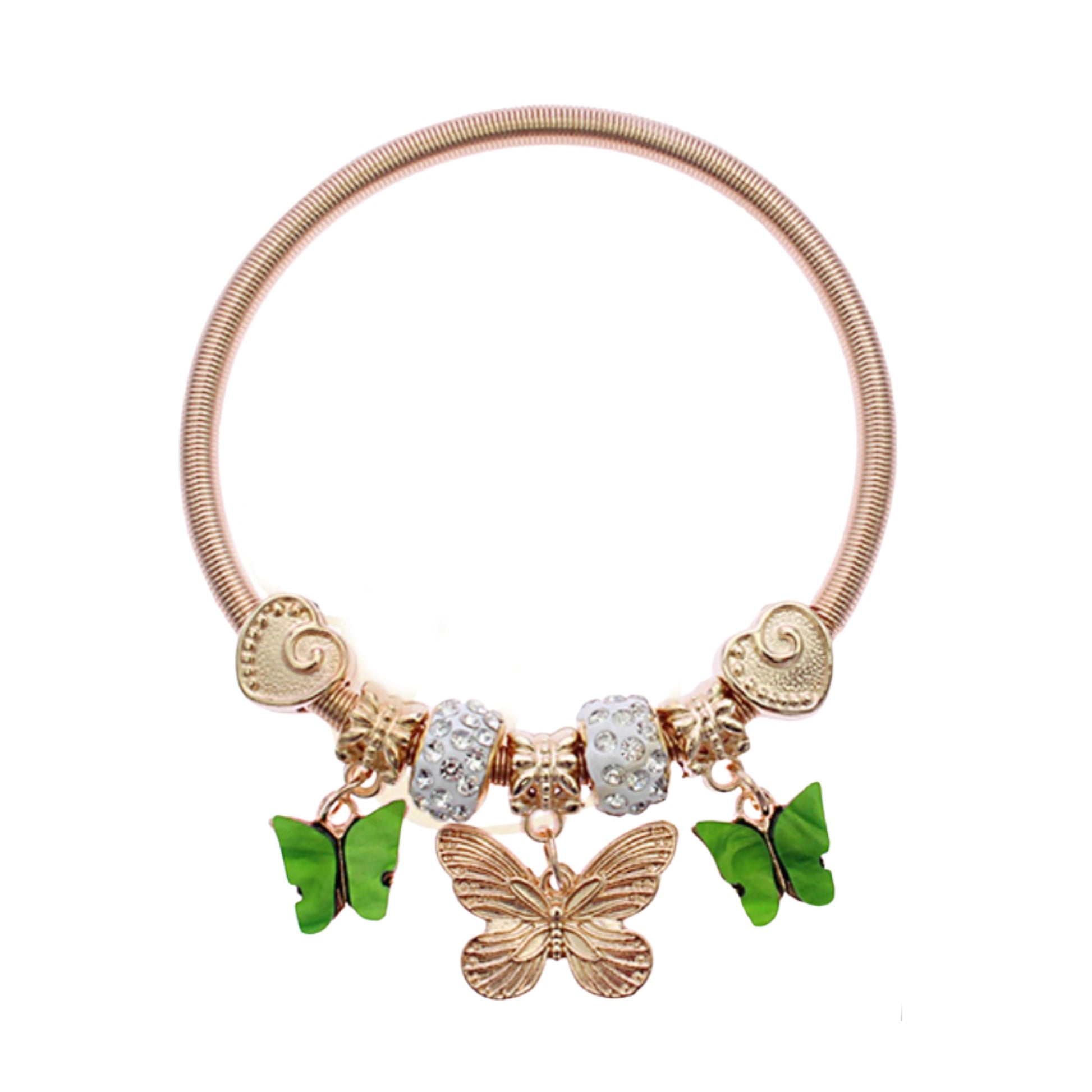 Embrace nature's beauty with this enchanting spring-style bangle bracelet. The flexible, rose-gold-tone wire band offers a comfortable, slip-on fit. The central cluster features three delightful butterfly charms: two vibrant green acrylic butterflies dangling playfully, and a central, finely detailed gold-tone metal butterfly.