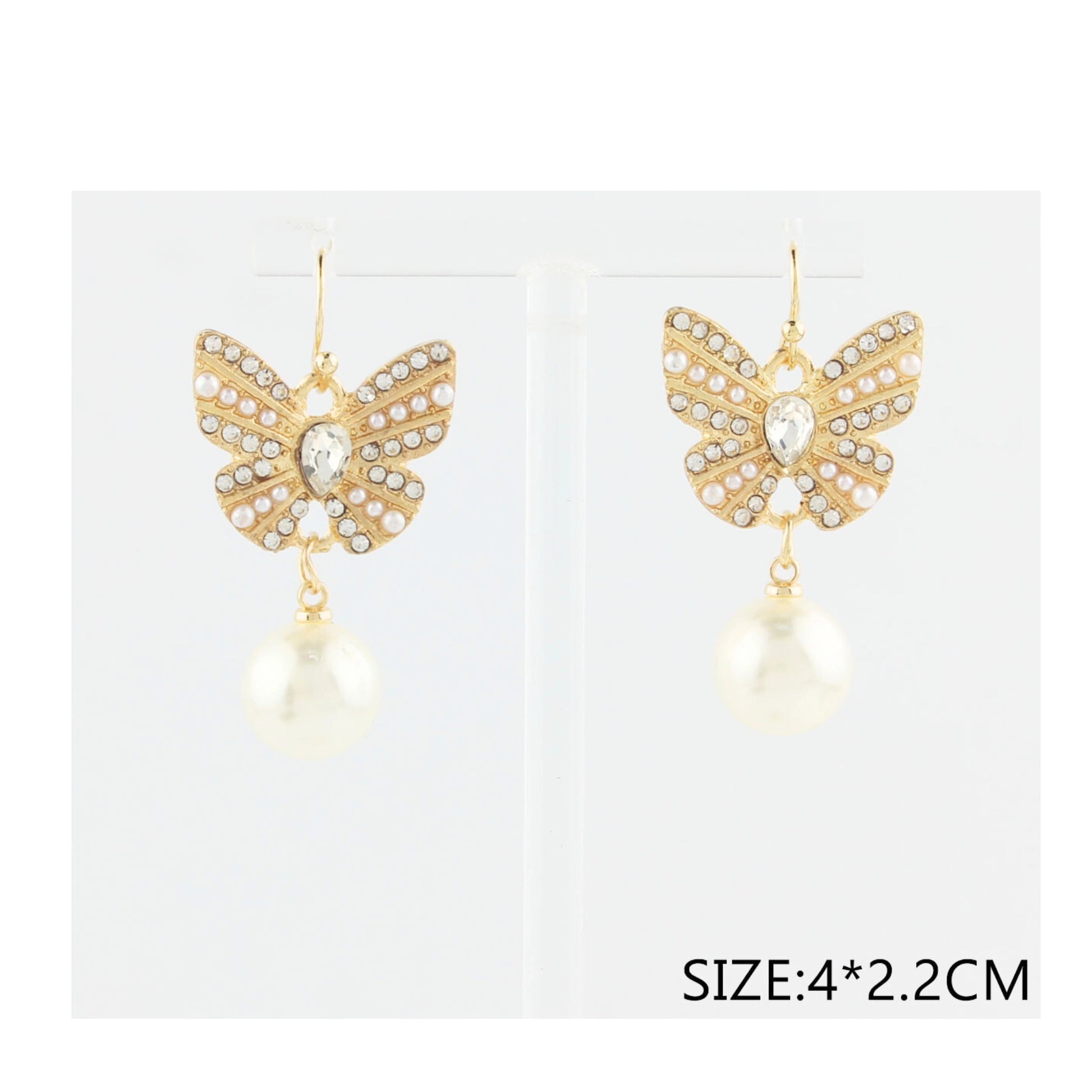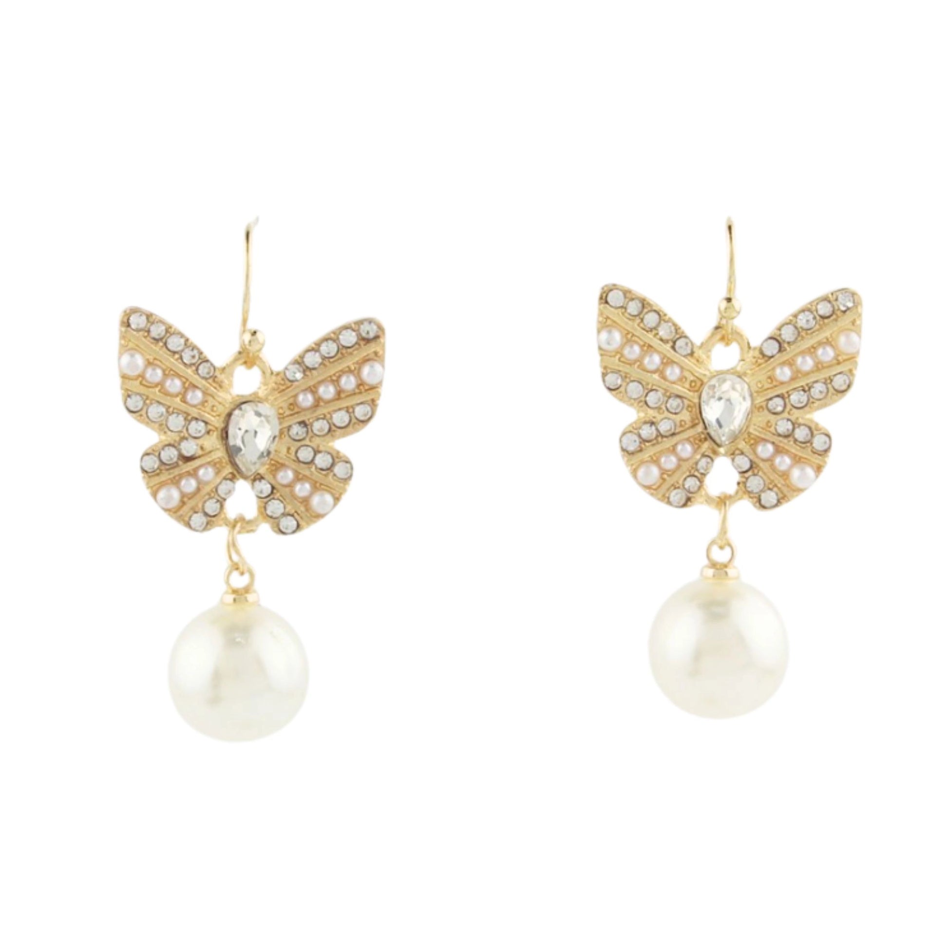 These captivating Butterfly Pearl Drop Earrings are designed to add instant vintage romance and sparkle to any outfit. The delicate gold-tone butterfly wings are richly detailed with alternating pave rhinestones and faux pearls, leading down to a luminous, suspended pearl drop.