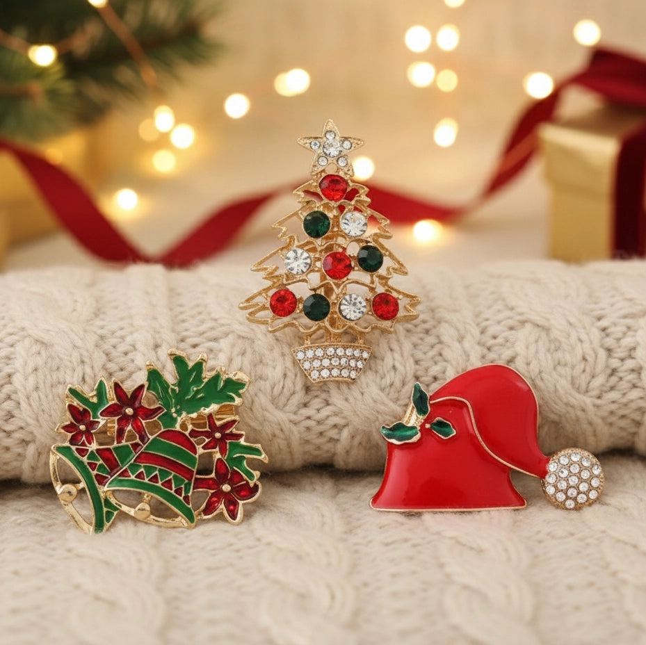 Elegant Christmas Brooch Set – 3-Piece Holiday Pins Santa Hat, Christmas Tree, Bells | 4CM