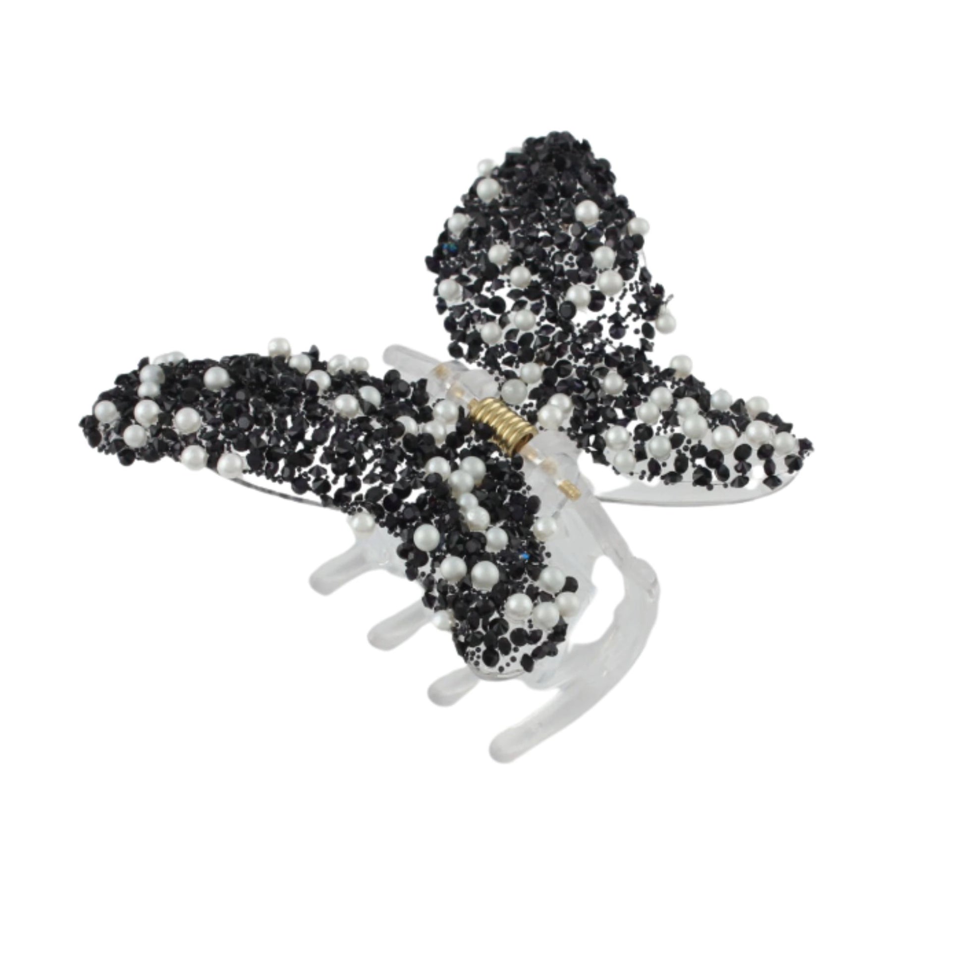 Elevate your half-up styles with this dazzling Butterfly Hair Claw! The 7cm clip features a detailed, intricate butterfly shape, completely encrusted with high-contrast black crystals and elegant white faux pearls.
