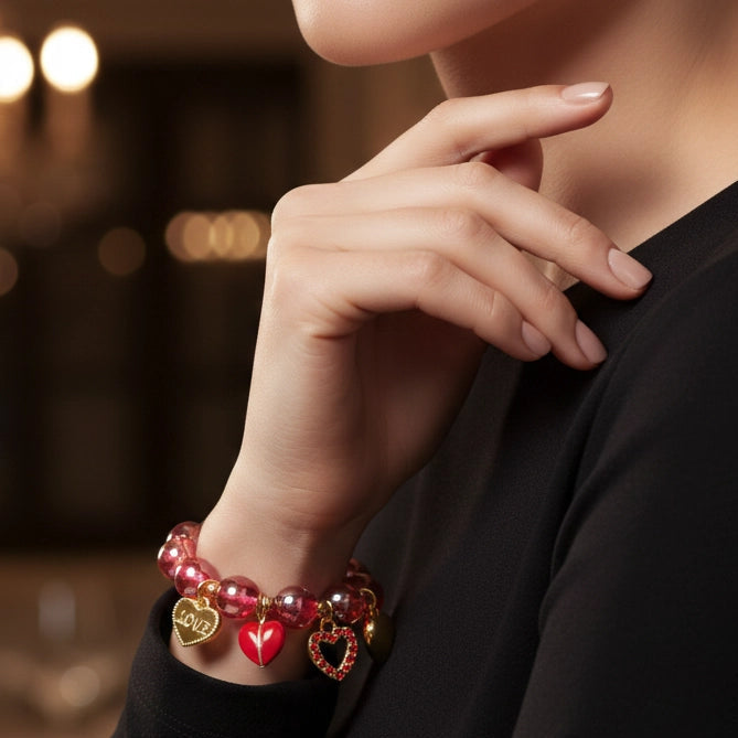 Elevate your jewelry collection with the Nicole Catena Design Beaded Charm Bracelet. This eye-catching piece combines the brilliance of iridescent beads with the romantic timelessness of heart charms. Designed for those who love bold, feminine aesthetics, this bracelet is as versatile as it is beautiful.