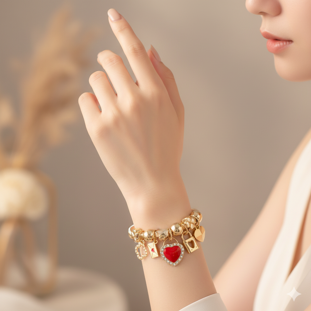 Heart Charm Bracelet - Gold & Silver Tone Multi-Charm Jewelry Set with Red & Pink Enamel Hearts
