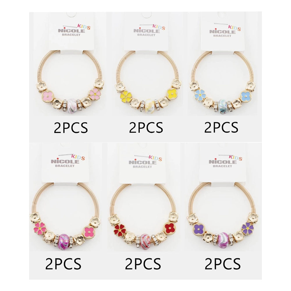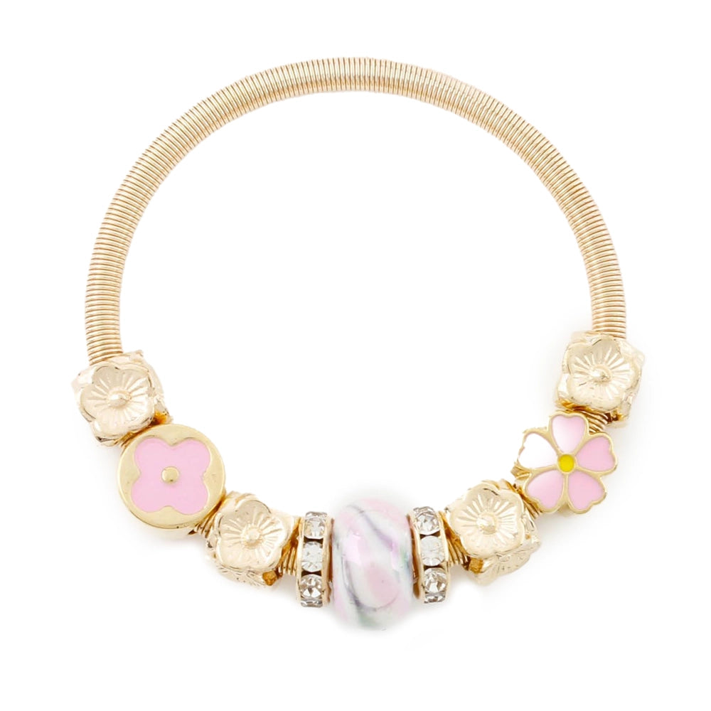 Kids' Floral Gold-Tone Coil Bracelet – Enamel Flower & Marble Bead Stretch Jewelry (CB2898)