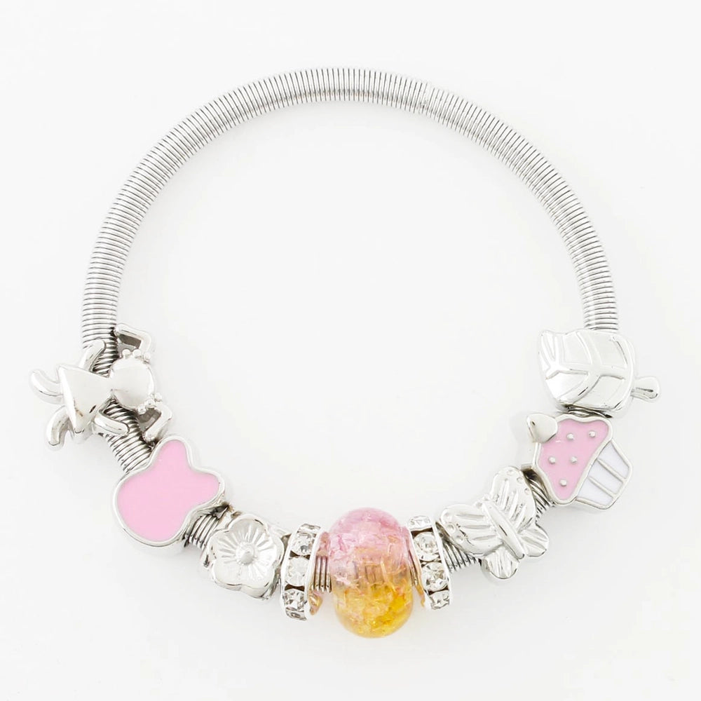 Brighten up any little one's accessory collection with this delightful Kids’ Charm Bracelet. Designed with a flexible, silver-tone coil band, these bracelets offer a comfortable, "one-size-fits-most" fit for children. Each piece features a whimsical collection of silver and enamel charms, including sweet cupcakes, delicate butterflies, and floral accents. A vibrant, faceted center bead adds a pop of sparkle and color to the wrist.