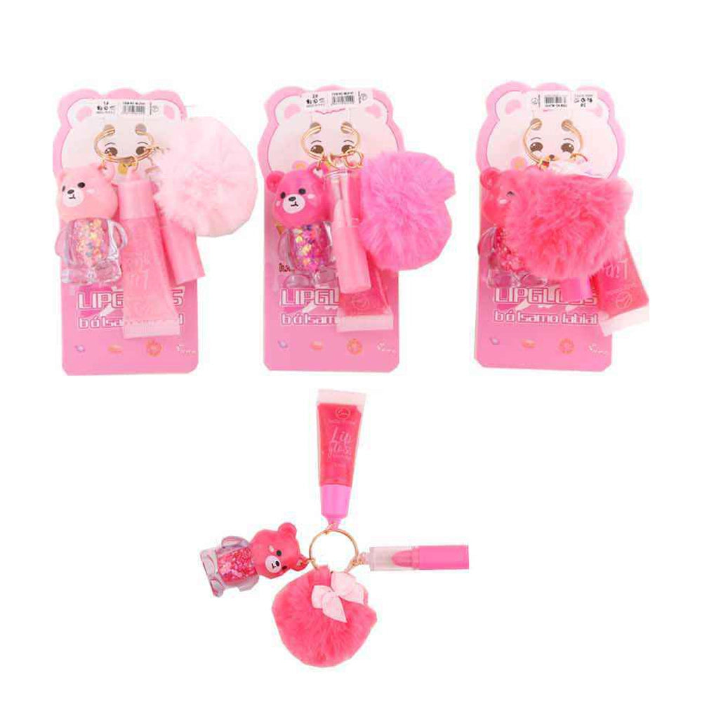 3-in-1 Bear Lip Gloss Keychain Set – Lucky | Includes Lip Balm, Lip Oil, & Glitter Gloss with Pink Pom-Pom Charm (DNV-3232)