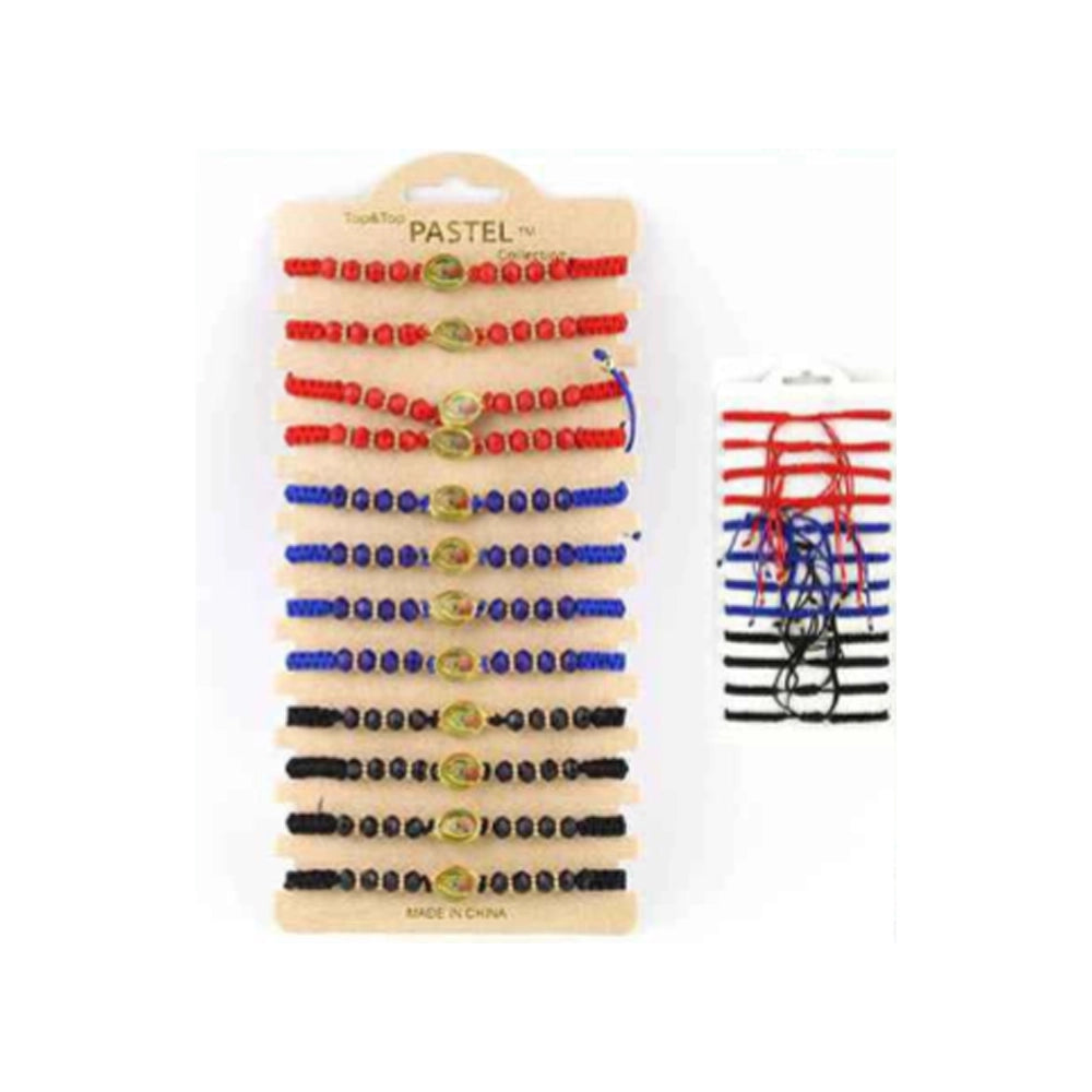 The bracelets are crafted with a durable macrame cord and accented with colored beads, available in three popular colors: traditional Red (for protection), deep Blue (symbolizing Mary), and classic Black. The adjustable tie closure ensures these bracelets fit most wrist sizes comfortably, making them ideal for all ages.