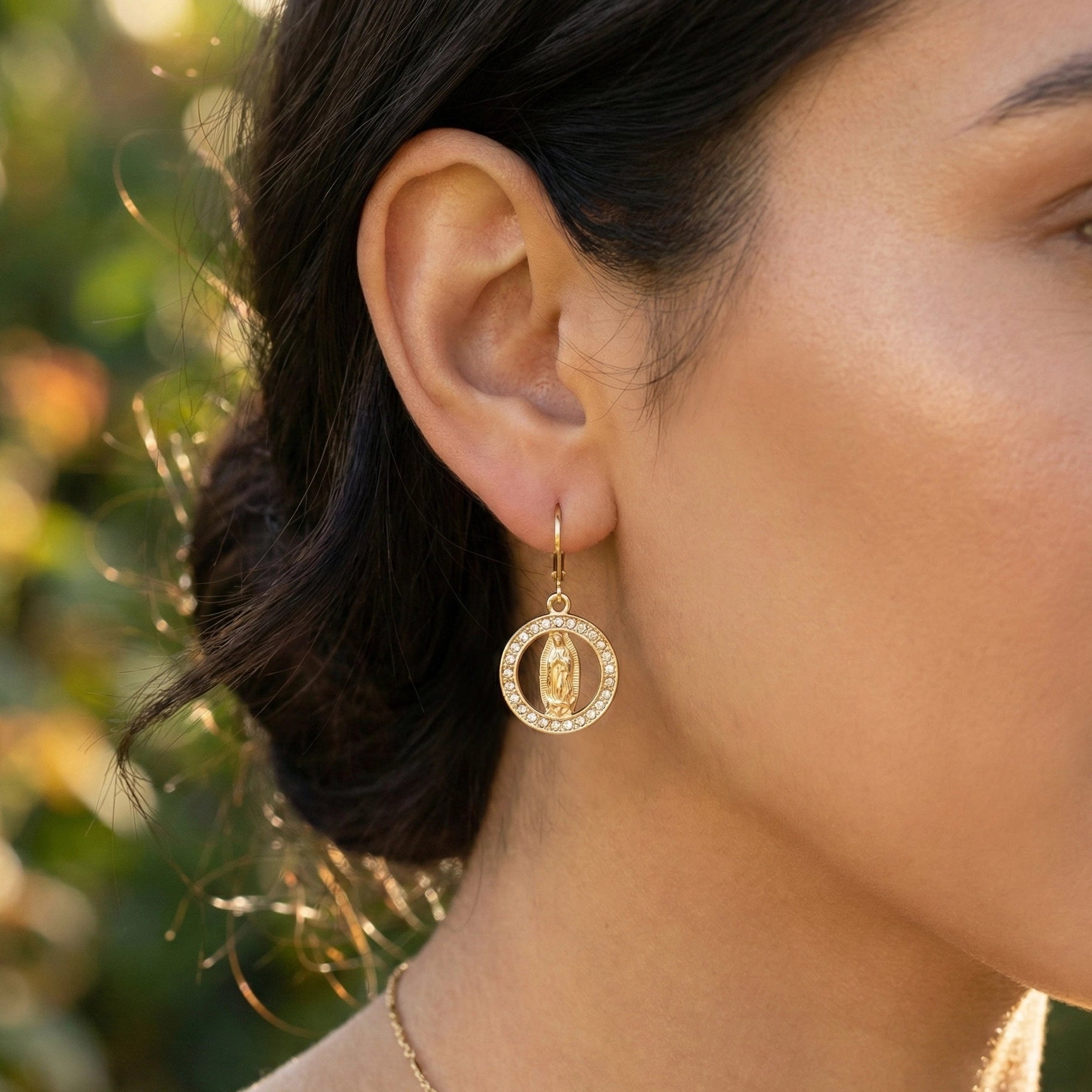 - Detailed Design: The set includes one pair of earrings featuring a Virgin Mary Cross and a second pair featuring a Circular Miraculous Medallion bordered by sparkling accents.