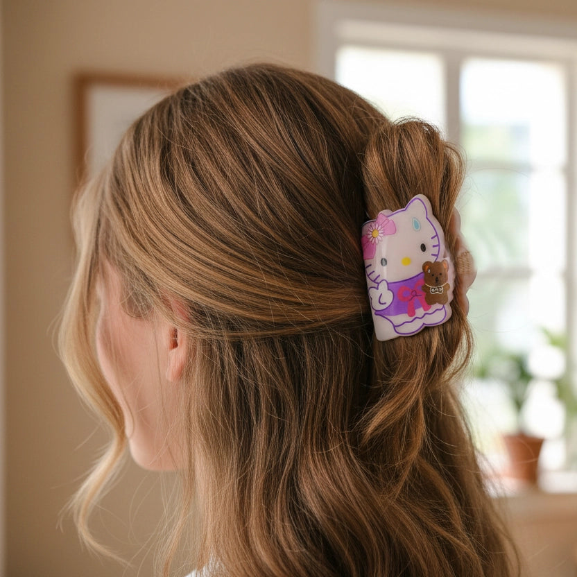Add a touch of playful nostalgia to your hairstyle with our Cartoon Kitten Acrylic Hair Claws. These medium-sized clips feature a sweet feline silhouette dressed in a colorful floral outfit, accompanied by a tiny brown bear companion. Crafted from durable, high-quality acrylic, these clips offer both a secure grip and a stylish "Y2K" aesthetic.