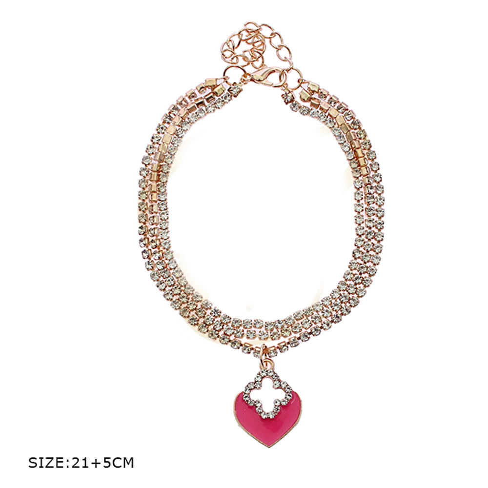 Featuring multiple delicate chains, one fully encrusted with brilliant rhinestones and the other a sleek snake chain, this anklet offers a luxurious stacked look without the hassle of multiple closures. The centerpiece is a high-polish, heart-shaped charm with a distinctive clover/quatrefoil design, available in several vibrant enamel colors.