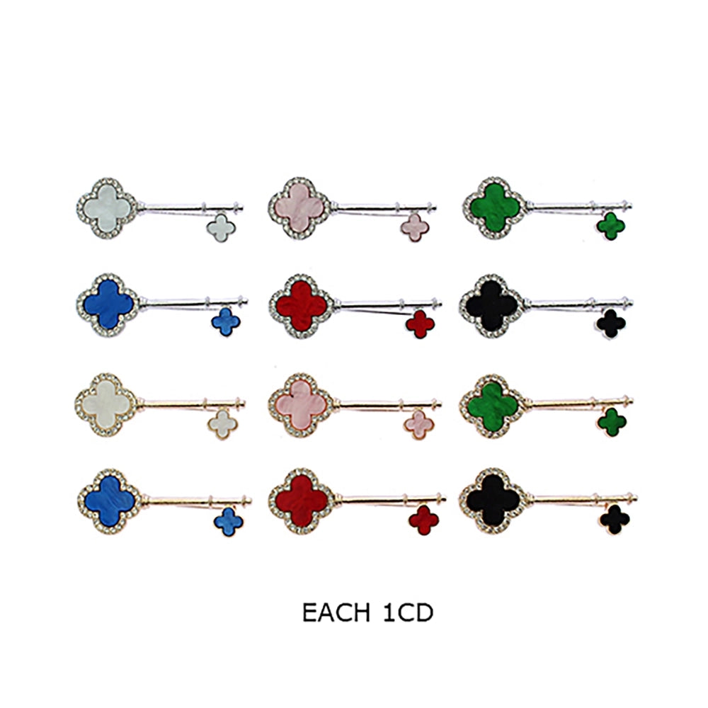 Quatrefoil Key Brooch Pin – Sparkling Crystal & Enamel Lucky Clover Charm Accessory (RBC-0233R6)