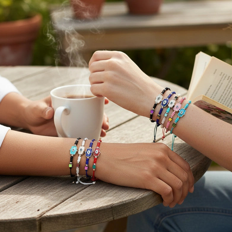 Hamsa Hand & Evil Eye Charm Bracelet Set (12-Pack) - Adjustable