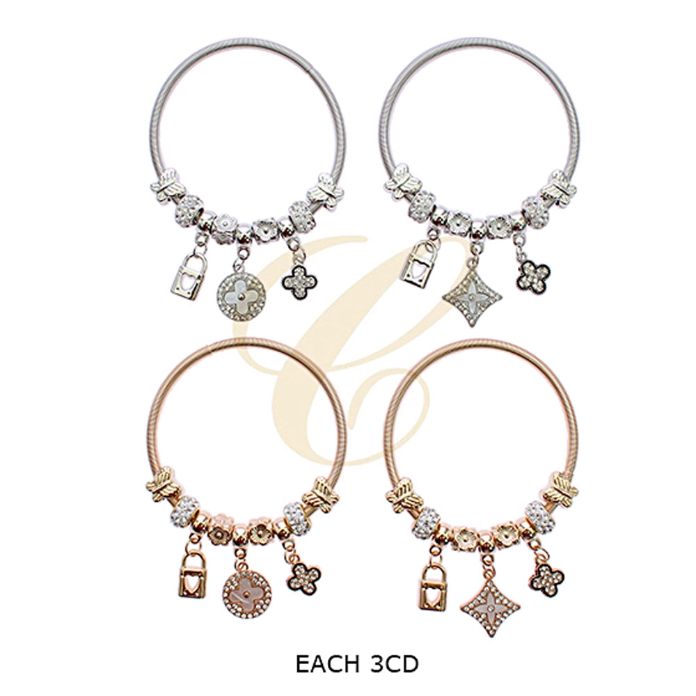 7cm Stretch Charm Bracelet for Women - Rose Gold & Silver Finish Bangle with Clover, Padlock, and Crystal Charms (RBT-2301GS)