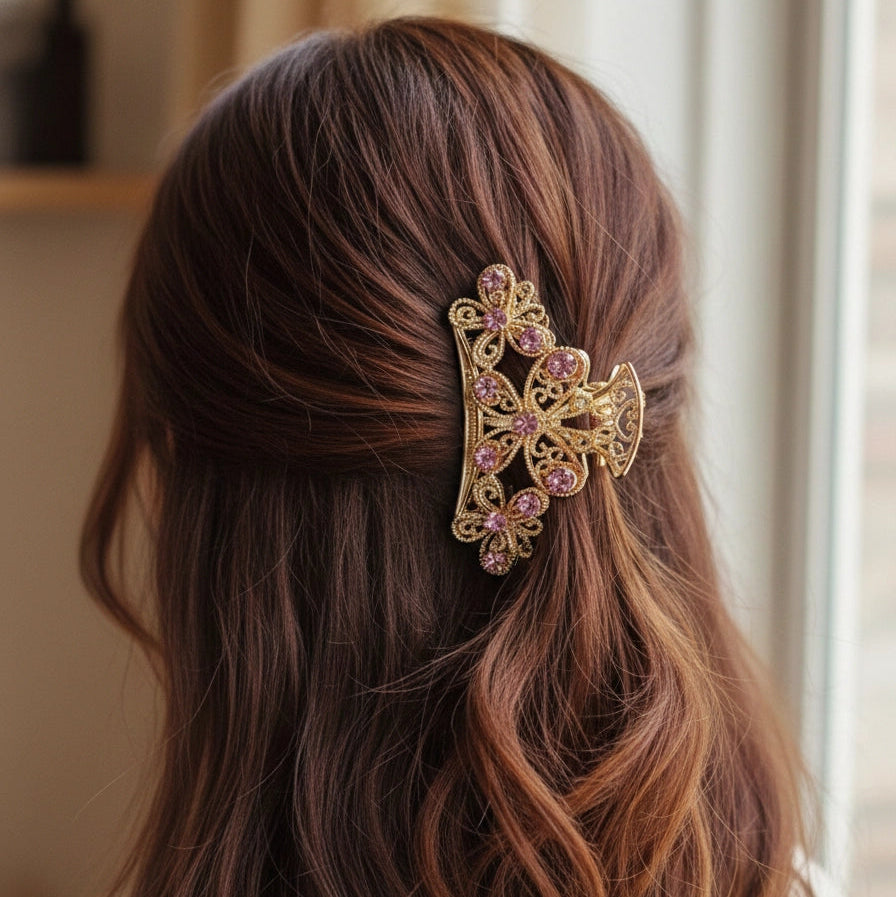 Elevate your hairstyle with timeless elegance. This exquisite 6cm hair claw clip combines vintage-inspired craftsmanship with modern durability. Featuring an intricate, floral-filigree butterfly design, this clip is the perfect accessory for adding a touch of glamour to your everyday look or securing your hair for a special occasion.