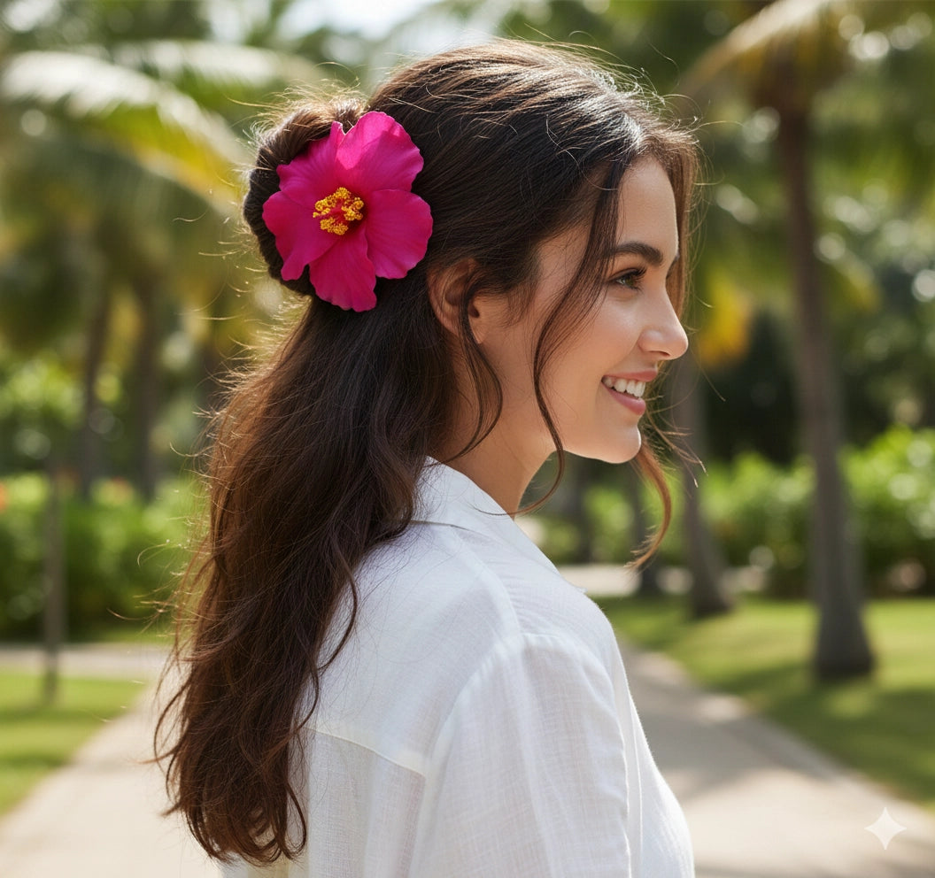 This item is a 10cm Artificial Hibiscus Hair Clip, a vibrant and tropical accessory designed to add a splash of color to any hairstyle or outfit. Modeled after the classic Hawaiian hibiscus, these flowers feature realistic petal textures and detailed yellow stamens.