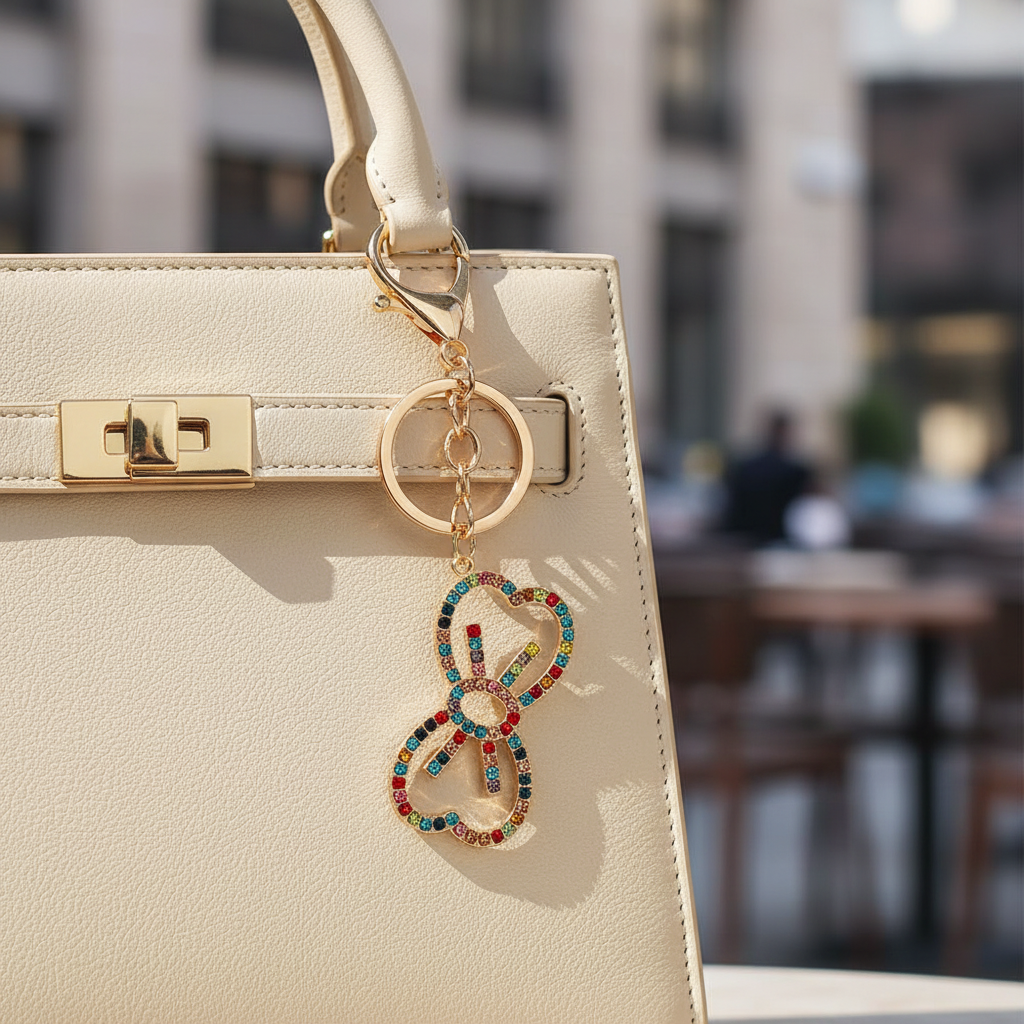 Designed with a classic hollow-out bow motif, this keychain features a durable metal alloy construction adorned with shimmering crystals. The versatile design includes both a traditional split key ring and a lobster claw clasp, making it easy to attach to lanyards, backpacks, or purses.