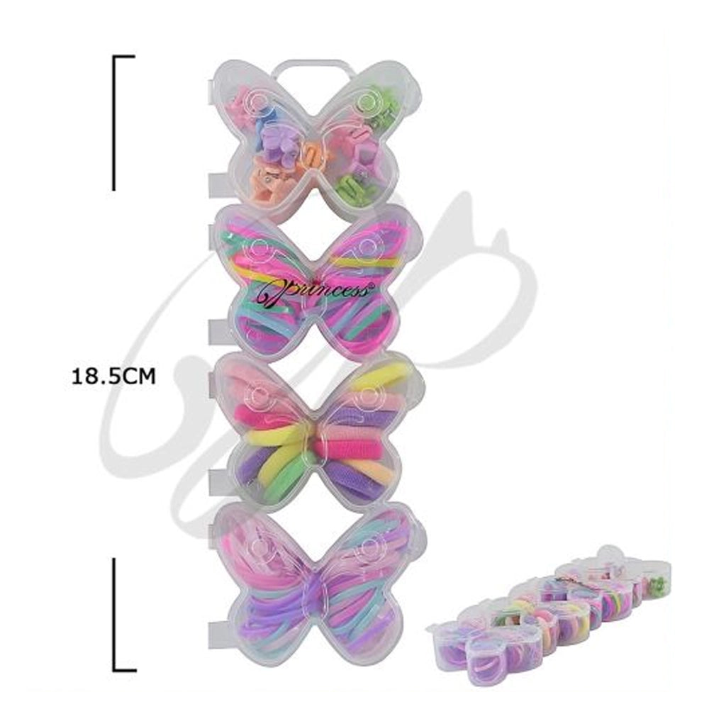 Butterfly Hair Accessory Gift Set – Clear Stackable Butterfly Cases with Colorful Elastic Hair Ties and Mini Hair Clips for Girls (TK-1016M)