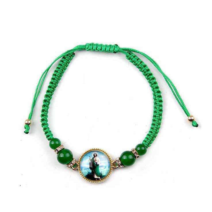 Carry a constant reminder of faith and guidance with this vibrant, richly-colored green macrame bracelet. It features smooth, polished green accent beads and a beautifully detailed central medallion depicting a protective figure.