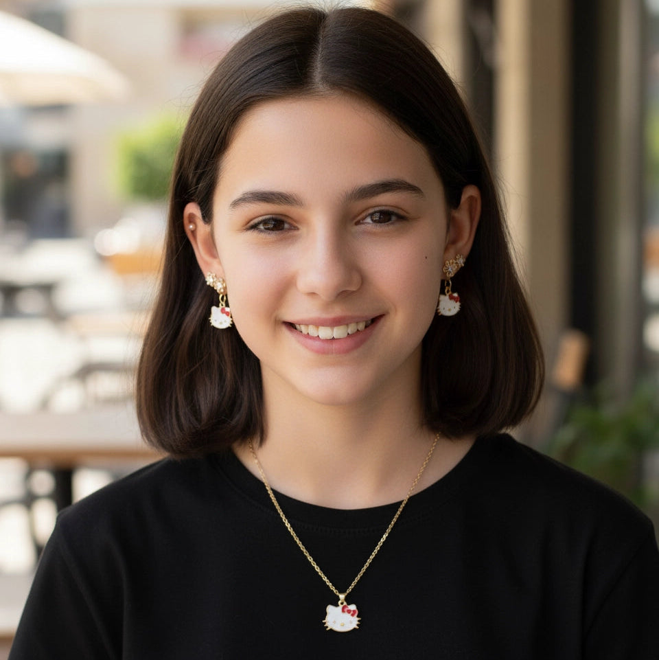 Add a touch of playful charm and sparkle to your accessory collection with this irresistible Kawaii Cartoon Cat Jewelry Set! Each set provides incredible value, featuring a gold-tone pendant necklace, charming dangle earrings, and delicate stud earrings, all inspired by the beloved white cat with a signature bow.