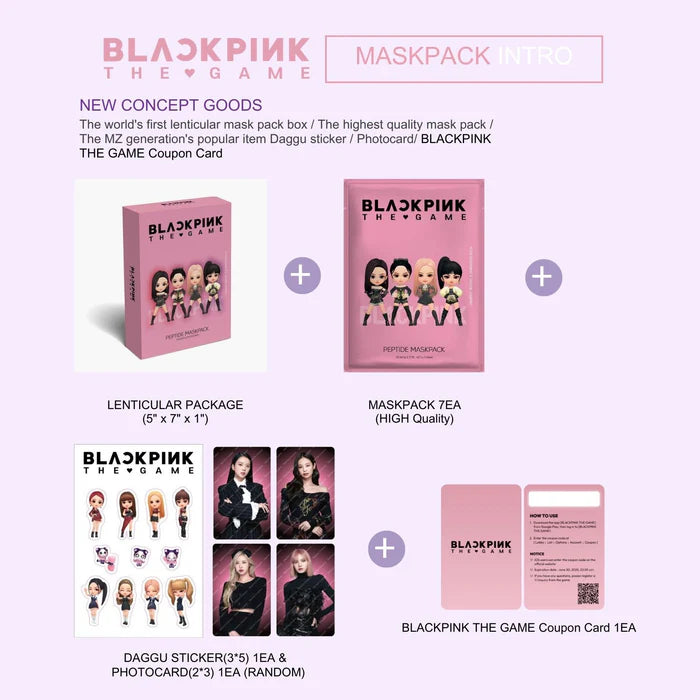 LENTICULAR BOX Includes: MASKPACK 7EA, STICKER 1EA (RANDOM),Ā PHOTOCARD 1EA (RANDOM),Ā GAME COUPON 1EA